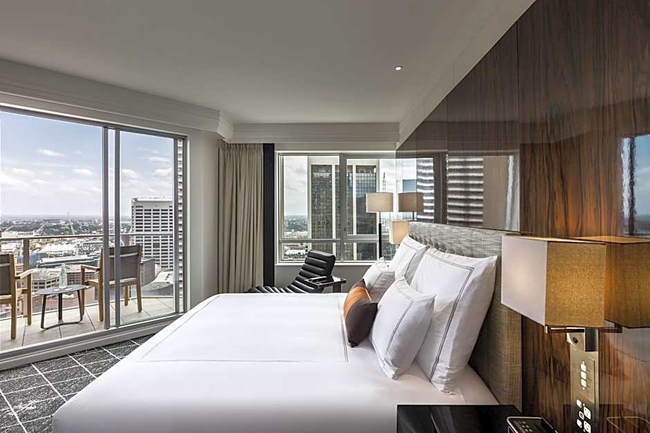 This room has a private balcony and is located above the 22nd floor offering views of the Queen Victoria Building. There is a Nespresso machine and a 40-inch TV. There is a rainfall shower and toiletries.